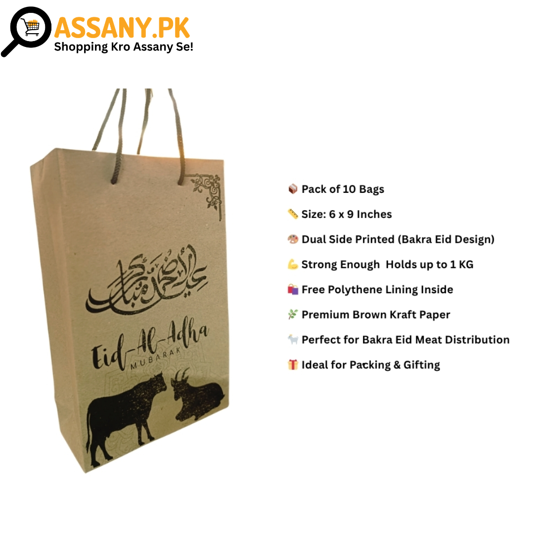 The Premium Eid Mubarak Brown Paper Bags with Polythene Inside (7×9 Inches – 1 Kg) Pack of 10 Pcs are specially designed to make your Eid Qurbani distribution clean, organized, and presentable. These bags combine durability, hygiene, and a festive design, making them an ideal solution for meat packing and sharing during Eid.